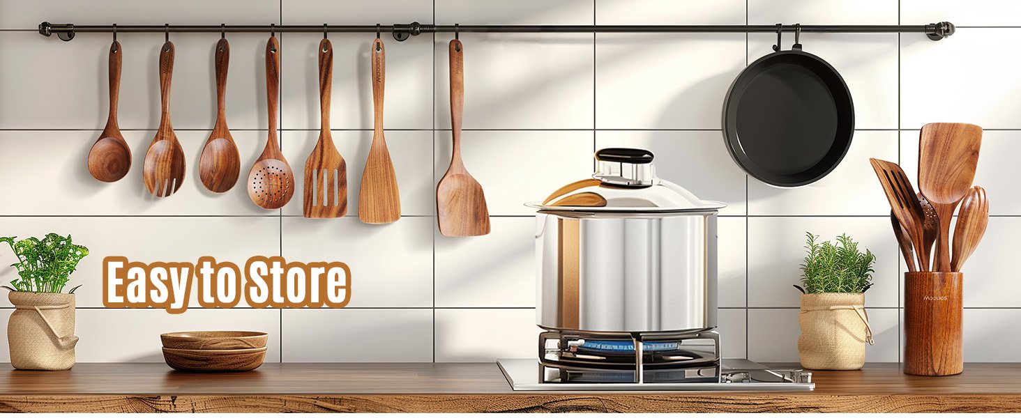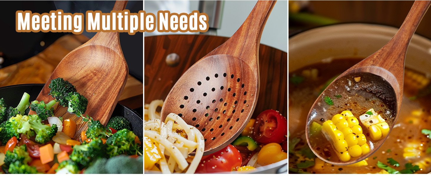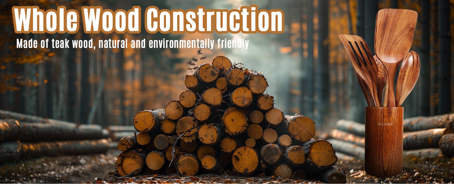 Natural Teak Wood: Our wood cooking utensils is made of natural solid teak, which is healthy and safe. Teak is densely grained, hard, and will not crack that it one of the most durable woods, stronger than silicone or bamboo. Wooden spoons are sanded by hand many times, and the surface is smooth will not hurt any cooking tools